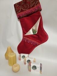 Many of us have fond childhood memories of exploring the contents of our Christmas stockings, filled with special goodies from Santa. You can revive those memories by choosing your stockings and some stuffers with delights from Imagine That! Three artists can help you with that. Sandra Holmes creates incredibly ornamented stockings (some even for your pet!), Melva Geldreich makes a variety of scented and un-scented soaps, and Carolyn Morris fashions a beautiful array of beeswax candles. Help Santa out and choose several gifts for your friends and family.